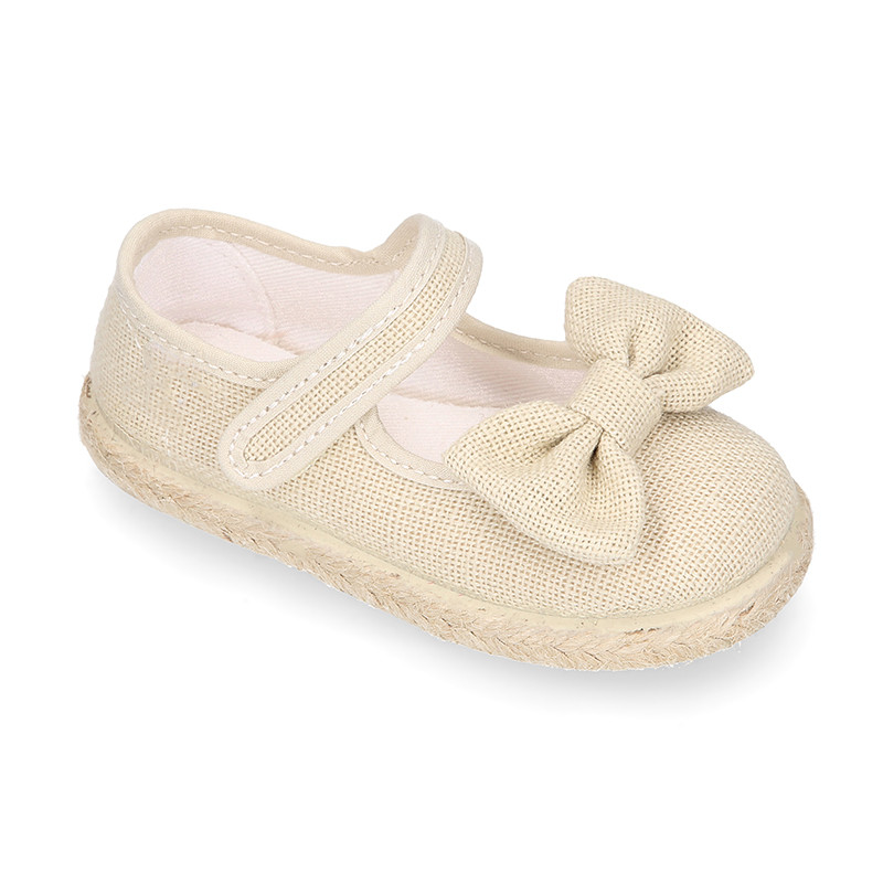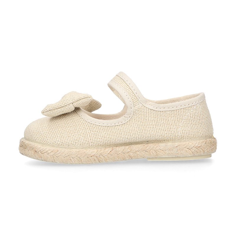 These children’s Mary Jane shoes are crafted from 100% natural cotton linen canvas, in a soft beige tone, ideal for the spring and summer seasons. The design features a decorative linen bow, adding a sweet and elegant touch, perfect for dressier looks without compromising on comfort.