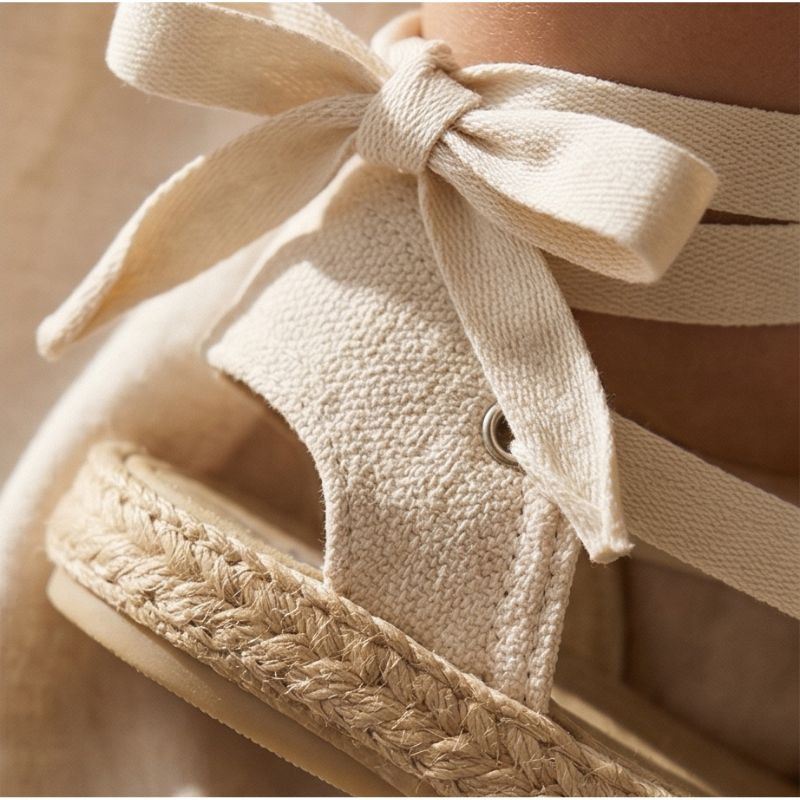 The design features a closed toe and a slightly open heel, with long cotton ties that start from the front panel and wrap around the ankle, creating a delicate, romantic silhouette.