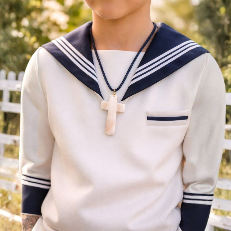 Nuevo collar de cordón con Cruz de Nácar para comunión para niños. Realizado artesanalmente en nuestro país. Combinarán con cualquier conjunto elegante de comunión, y luego podrá ser un complemento perfecto para cualquier look esta Primavera-Verano.