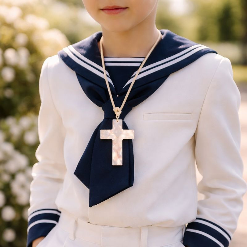 Nuevo collar de cordón con Cruz de Nácar para comunión para niños. Realizado artesanalmente en nuestro país. Combinarán con cualquier conjunto elegante de comunión, y luego podrá ser un complemento perfecto para cualquier look esta Primavera-Verano.