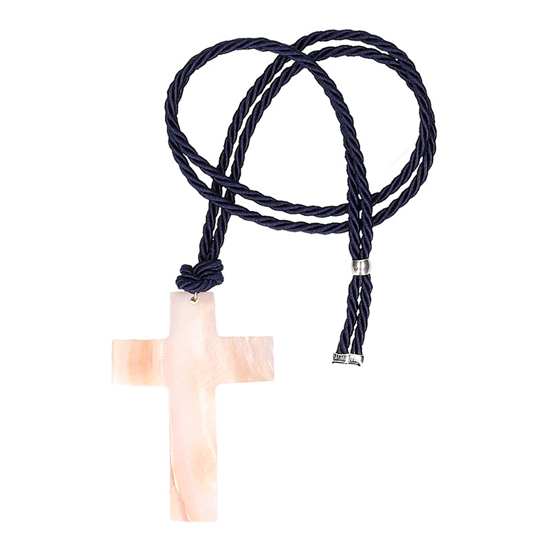 Composición: Piedra Natural y cruz de nacar con todos los remaches en acero con baño. Son antialérgicos y nos se ponen feos. El nácar o también llamado madreperla es un elemento natural, un bio mineral que se produce en el mar y por tanto puede presentar vetas de color que forman parte de su propia belleza natural. Cordón de cuerda súper suave y elegante.