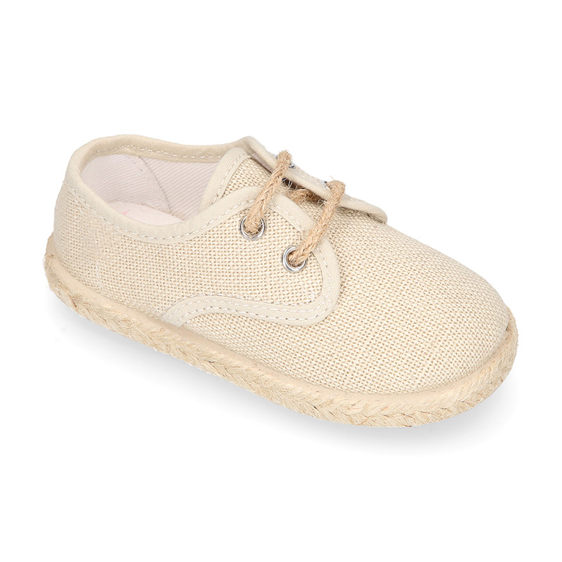 Esta alpargata tipo blucher para niños está confeccionada en lona de algodón lino 100% natural, en un elegante tono beige, perfecta para acompañarles durante toda la primavera-verano.