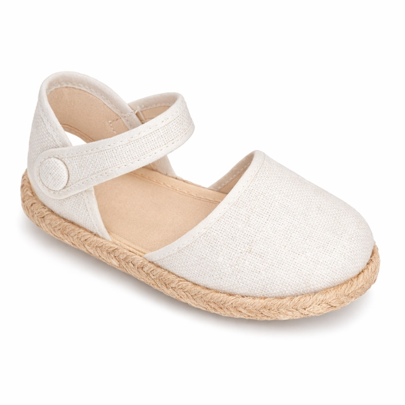 Esta alpargata infantil CEREMONIA está confeccionada en lona de algodón lino 100% natural, en un suave tono blanco, beige o maquillaje, ideal para la primavera y el verano. Su diseño con cierre adherente con botón aporta un toque dulce y elegante y un mejor agarre, perfecto para looks más arreglados sin renunciar a la comodidad. Con diseño con botón a tono.