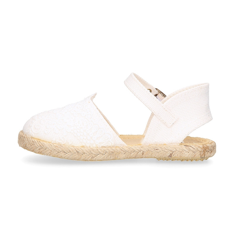 Esta alpargata infantil CEREMONIA está confeccionada en lona de algodón lino 100% natural, en un suave tono blanco o beige, ideal para la primavera y el verano. Su diseño con cierre de hebilla aporta un toque dulce y elegante y un mejor agarre, perfecto para looks más arreglados sin renunciar a la comodidad. Con diseño con puntilla HOJAS a tono.