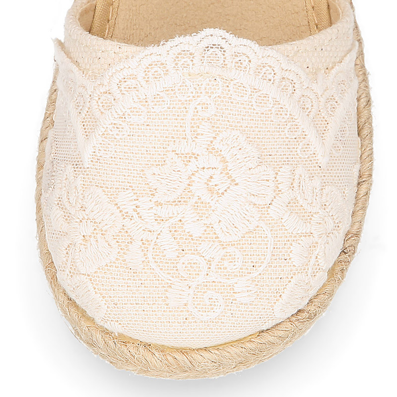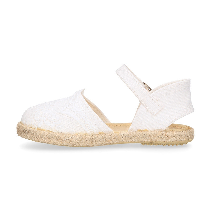 Esta alpargata infantil CEREMONIA está confeccionada en lona de algodón lino 100% natural, en un suave tono blanco o beige, ideal para la primavera y el verano. Su diseño con cierre de hebilla aporta un toque dulce y elegante y un mejor agarre, perfecto para looks más arreglados sin renunciar a la comodidad. Con diseño con puntilla ONDAS a tono.