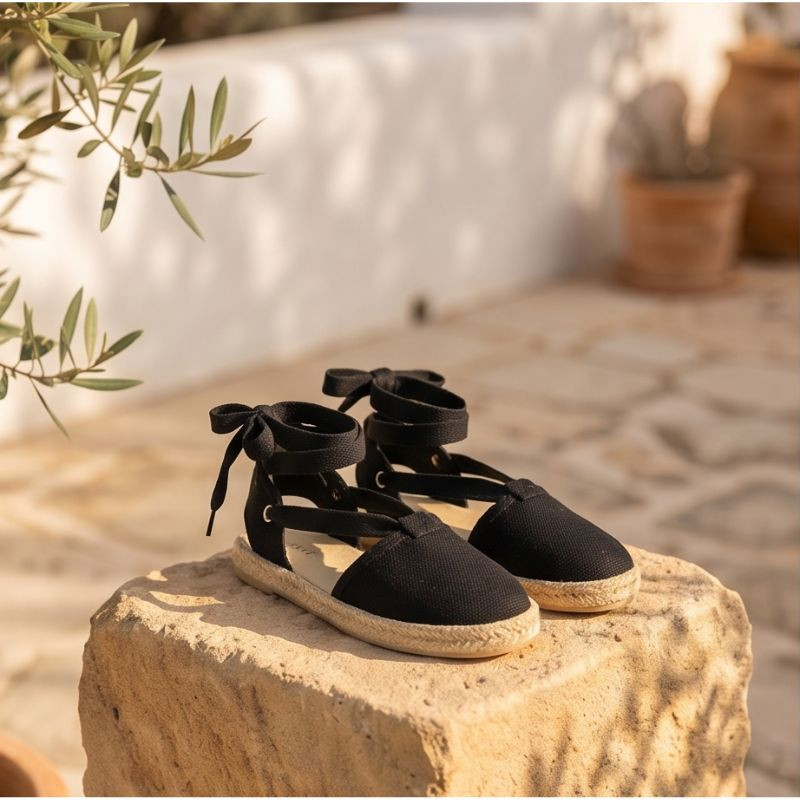 La alpargata niña negra con cintas es un modelo elegante y atemporal, diseñado para combinar estilo, comodidad y un acabado artesanal de alta calidad.