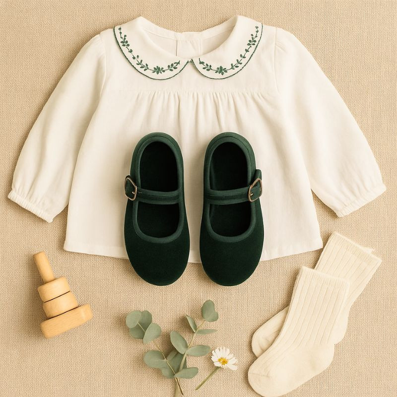Nueva Mercedita para niña con hebilla en lona de terciopelo, color verde