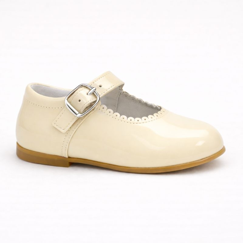 Fabricada en España con piel natural de primera calidad, esta mercedita destaca por su acabado en charol brillante, suave al tacto y resistente, ideal para acompañar a las más pequeñas en sus momentos más importantes.