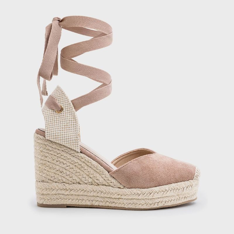 Destaca por su pala en ante suave de alta calidad en tonos empolvados, combinada con talonera en tejido natural y cierre mediante cintas largas al tobillo que aportan un aire femenino y estilizado.