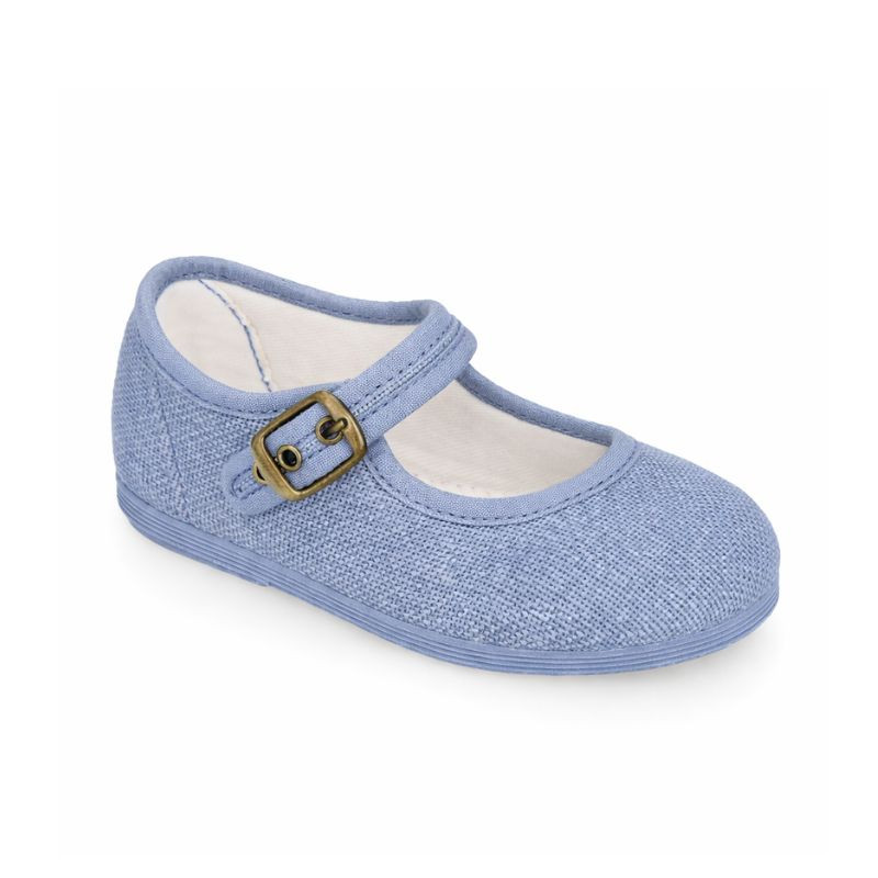 Esta mercedita infantil está confeccionada en lona de algodón lino 100% natural, en un suave tono azul medio, ideal para la primavera y el verano. Su diseño aporta un toque dulce y elegante, perfecto para looks más arreglados sin renunciar a la comodidad.